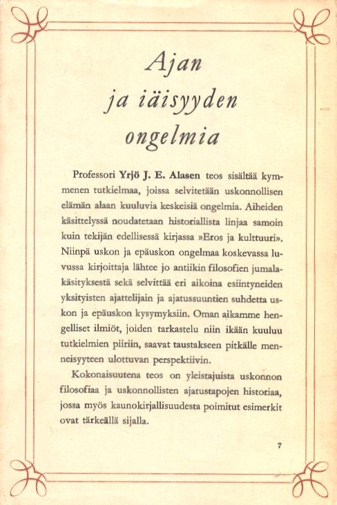 Alanen, Yrjö J. E. 1960: Ajan ja iäisyyden ongelmia