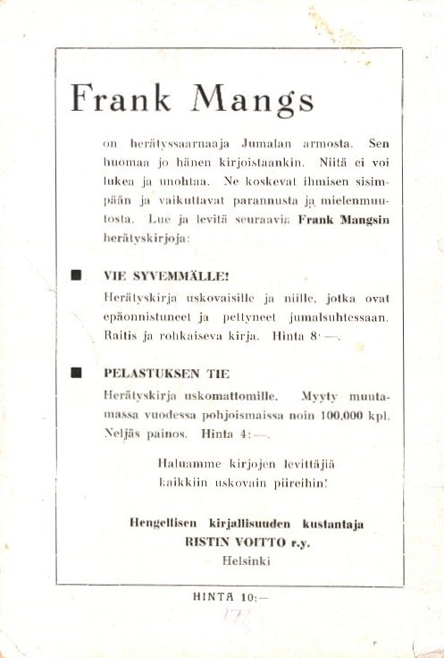 • Julkaistu: Helsinki, Ristin voitto, 1938