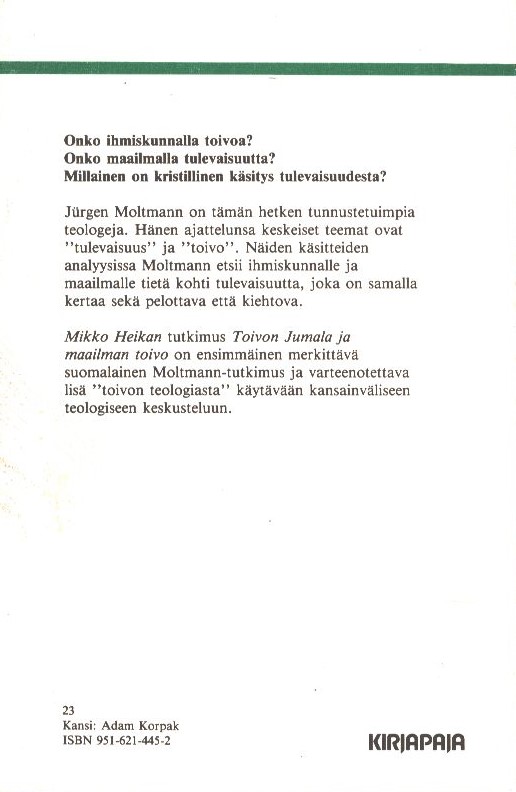 - Nimike: Toivon Jumala ja maailman toivo: Jürgen Moltmannin dialektinen todellisuuskäsitys
