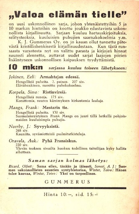 - Julkaistu: Jyväskylä, Gummerus, 1932