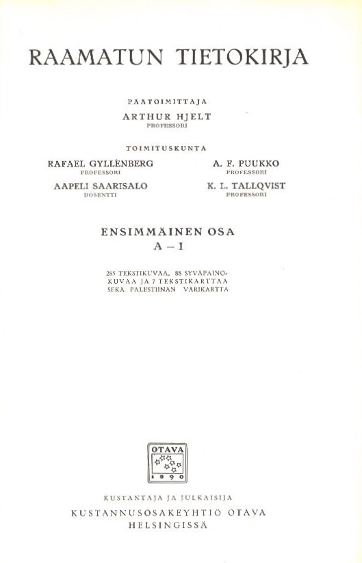 Ensimmäinen osa A-I. Päätoimittaja Arthur Hjelt.