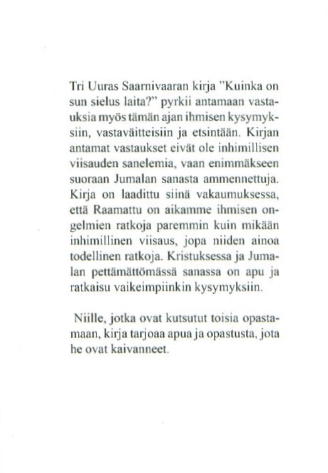 • Nimike: Kuinka on sun sielus laita? Tienviittoja sekä tietä kyseleville että sitä vältteleville