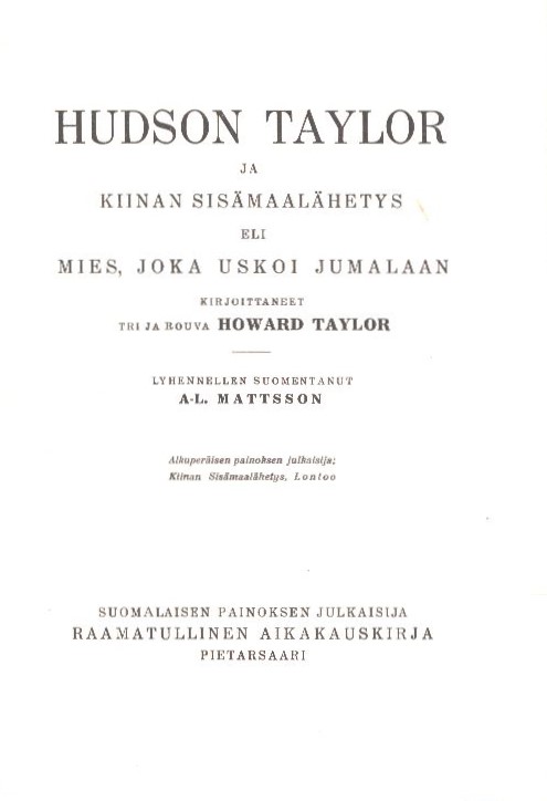 - Nimike: Hudson Taylor ja Kiinan sisämaalähetys, eli mies, joka uskoi Jumalaan